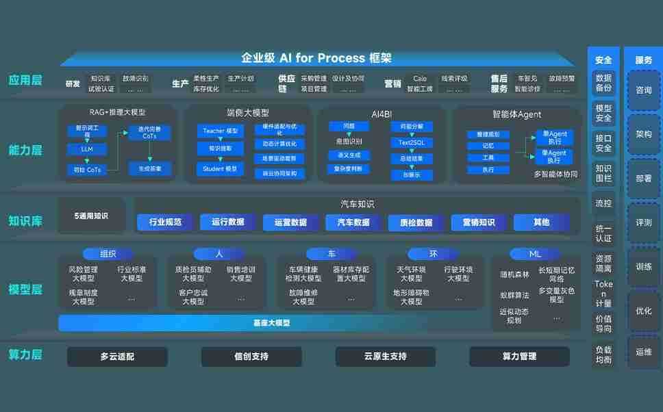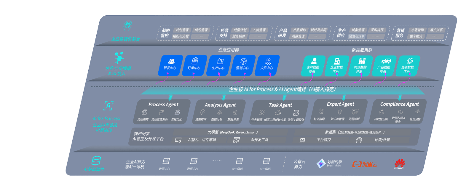 端到端的一站式AI工作空间深度融合了从企业战略规划到日常经营的全流程业务板块,,,,定向解决车企内部领域多、、、、部门多、、、、链条长、、、场景碎片化等难题,,,,支持车企快速构建以AI为核心的生产力写作体系,,实现任务执行与AI能力的无缝集成与交互