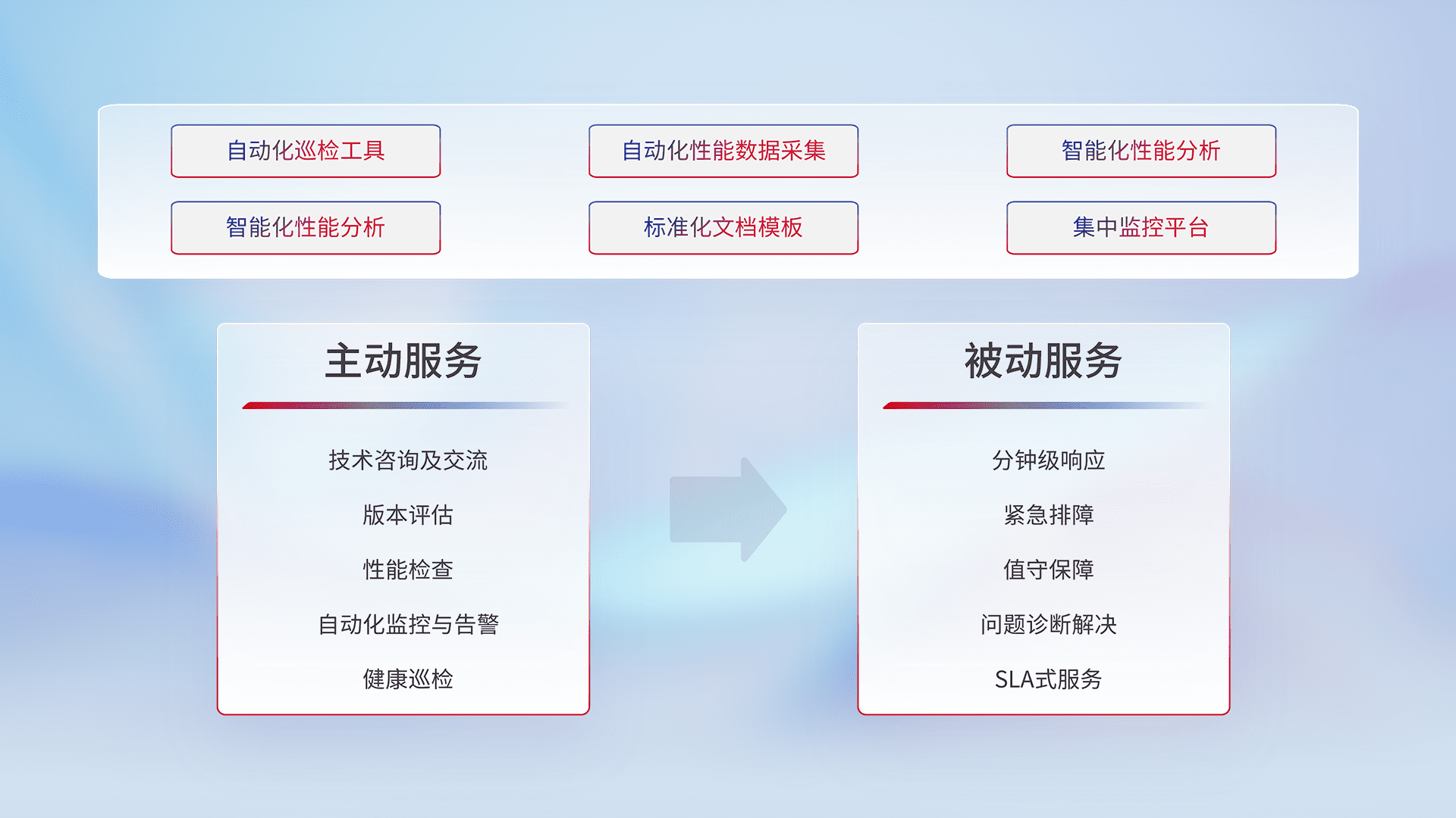 智能化工具和标准化文档,,,保障服务质量,,,提供主动服务(包含技术咨询、、、版本评估、、、性能检查、、自动化监控与告警、、、健康巡检)和被动服务包含(分钟级响应、、、、紧急排障、、值守保障、、、、问题诊断解决、、、SLA服务)。。。。
