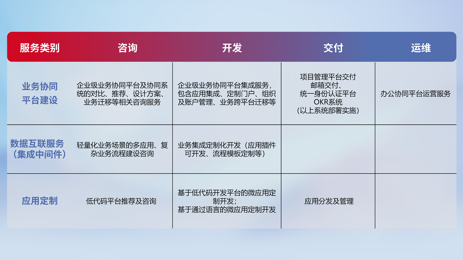 针对钉钉、、企微、、、、IDaas等平台级产品提供产品的规划、、、、方案、、交付、、、定制化开发等服务,,,,实现如统一协同办公、、、、智能客户服务、、混合会议管理、、、、智能数据查询、、等业务场景,,,,实现数字化转型。。